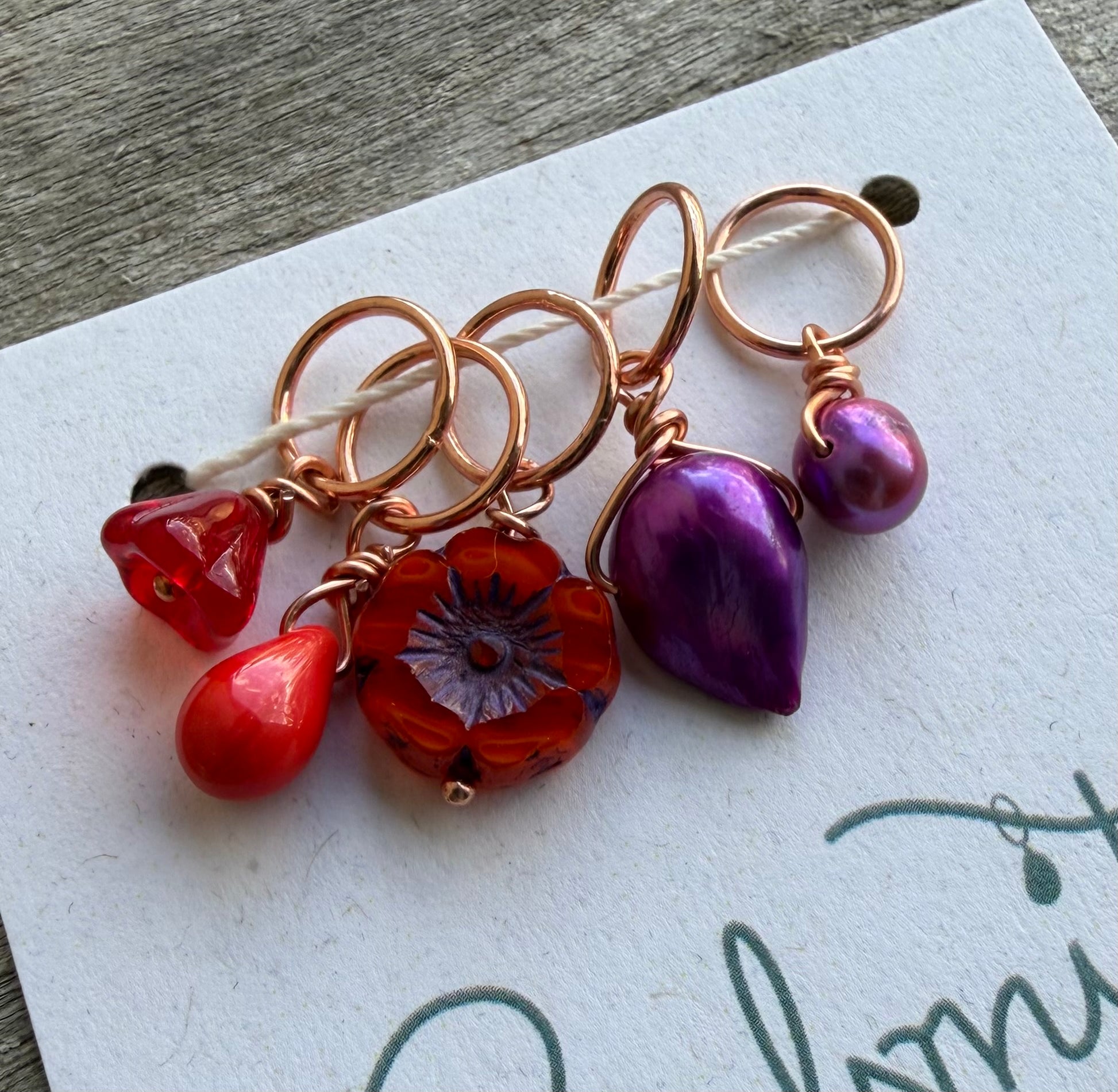 Inspired by the red & purple cut glass blossom, this mix of 5 markers includes glass charms and genuine freshwater pearls.