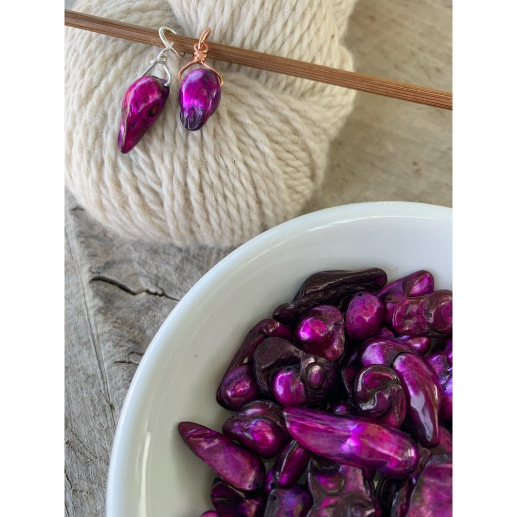 Saturated berry purple color on larger organically shaped baroque pearls. Make great bor markers or progress keepers. I wouldn’t recommend them for sock knitting.