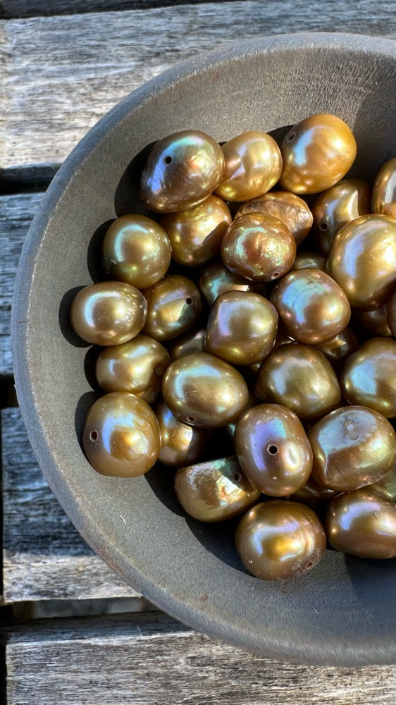 A plump flat backed freshwater pearl in a rich golden olive color. A bit darker than Martini and similar to Chartreuse.