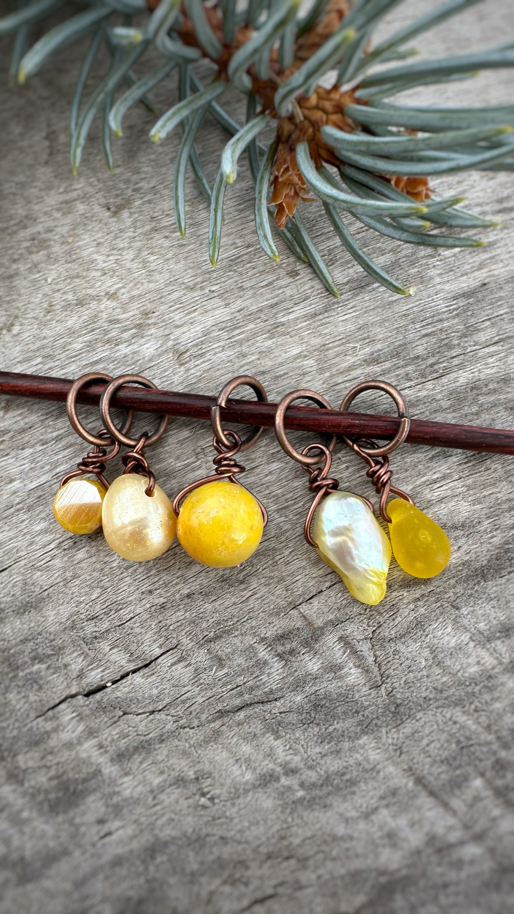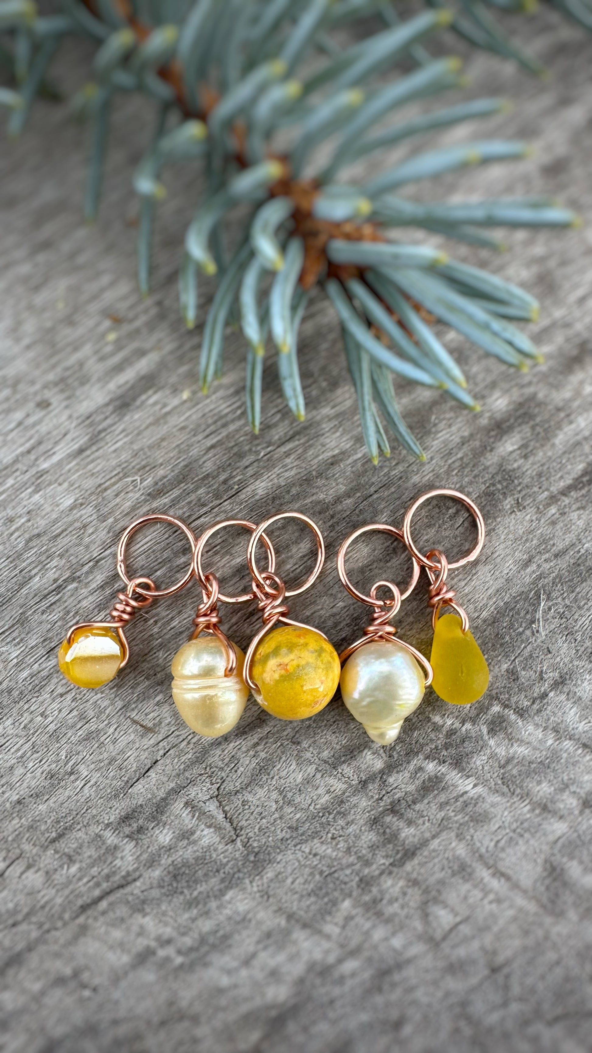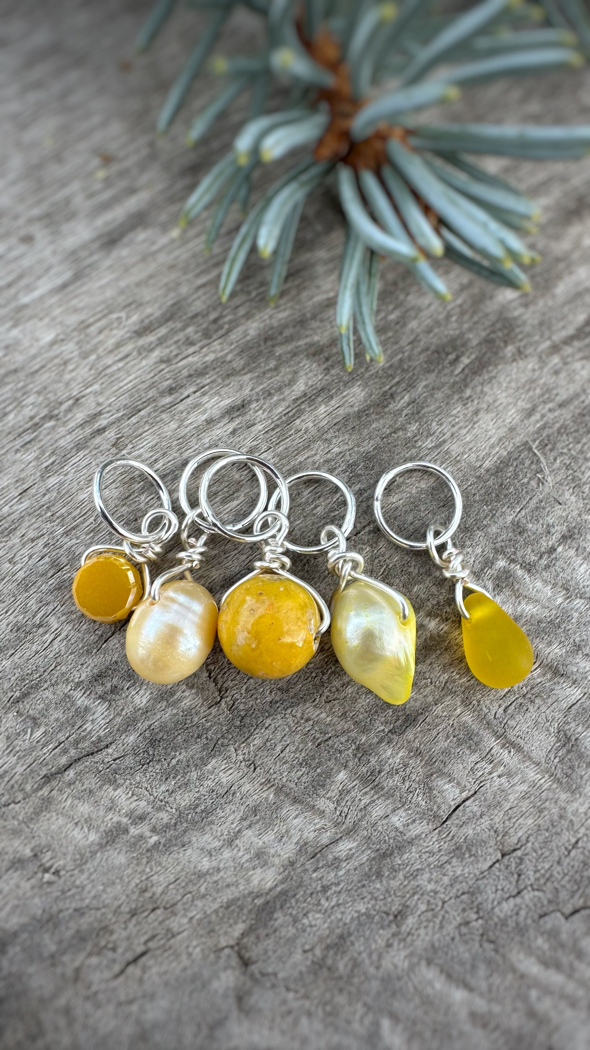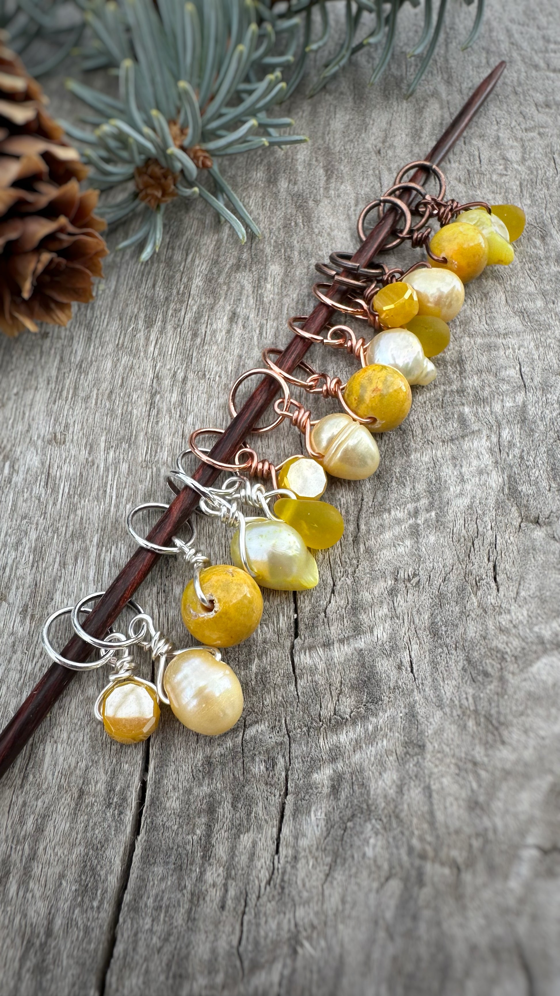 The Yellow Mix contains 2 freshwater pearls, 1 glass drop, 1 crystal macaron and a Bumblebee Jasper gemstone.