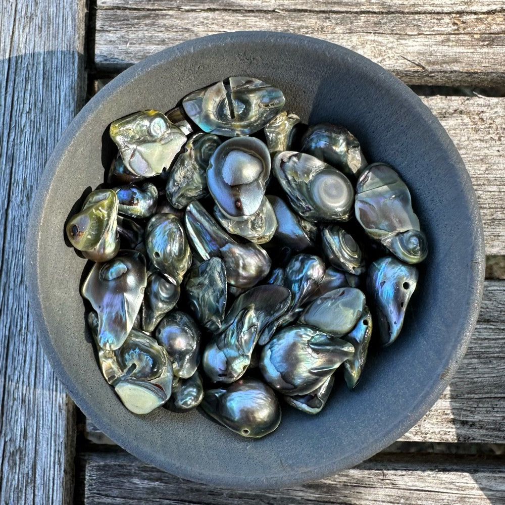 A beautiful new baroque shaped freshwater pearl in a deep green with a gray undertone. A bit darker than Mossy Brick.
