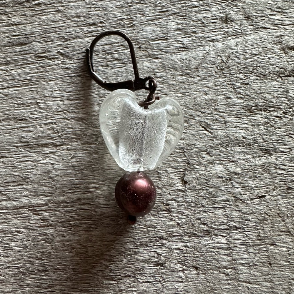 A beautiful, flameworked glass heart and a freshwater pearl on a n antique copper opening clasp.