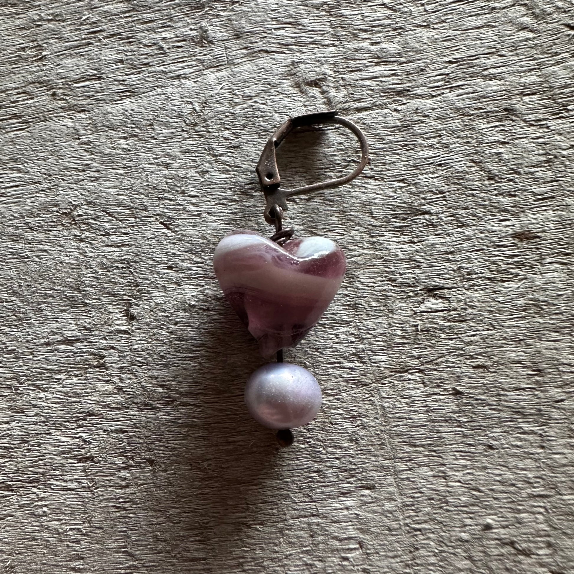 A beautiful, flameworked glass heart and a freshwater pearl on a n antique copper opening clasp.