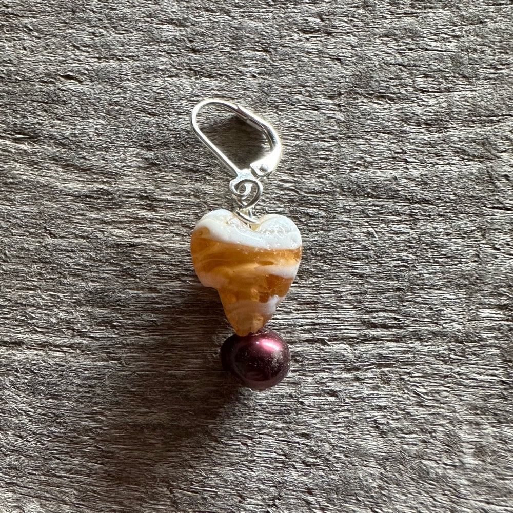 A beautiful, flameworked glass heart and a freshwater pearl on a shiny silver opening clasp.