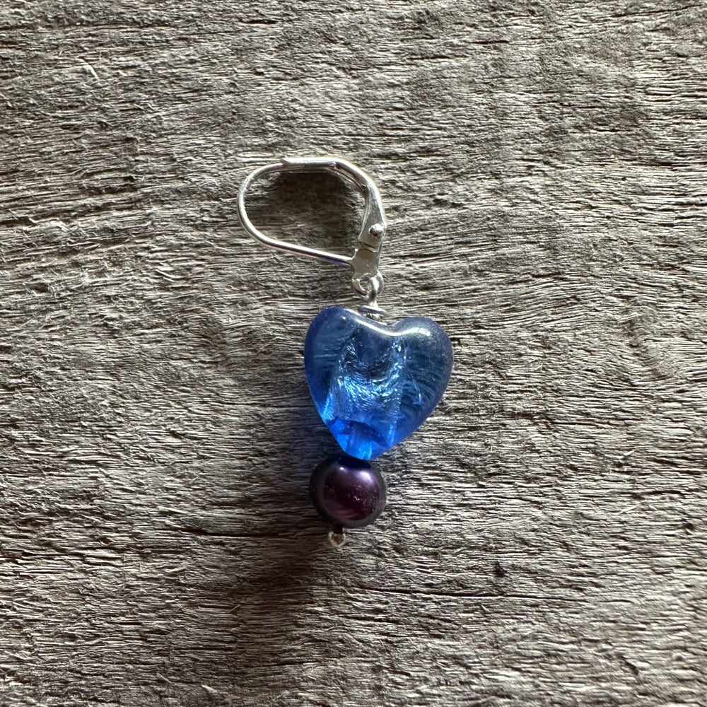 A beautiful, flameworked glass heart and a freshwater pearl on a shiny silver opening clasp.