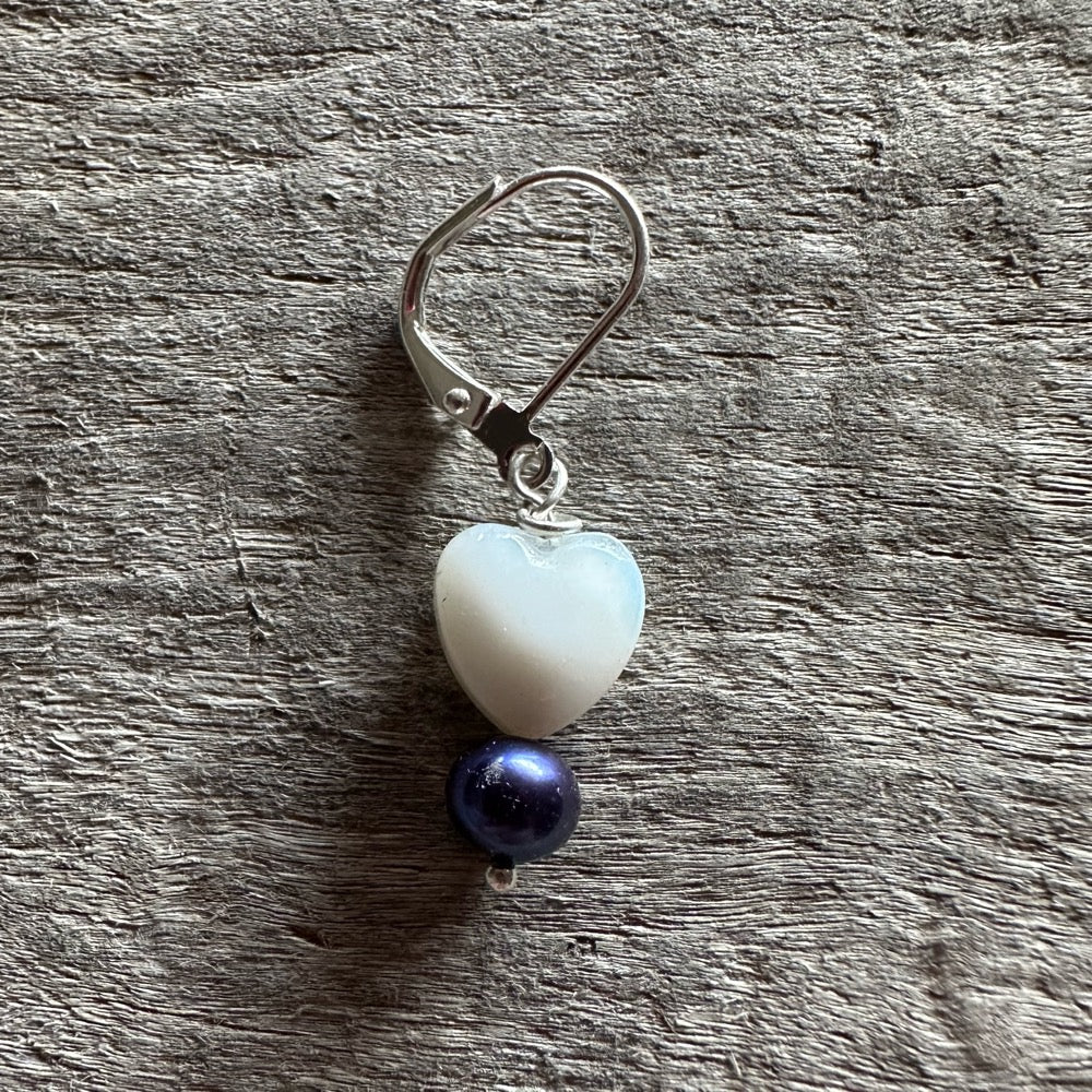 A beautiful, flameworked glass heart and a freshwater pearl on a shiny silver opening clasp.