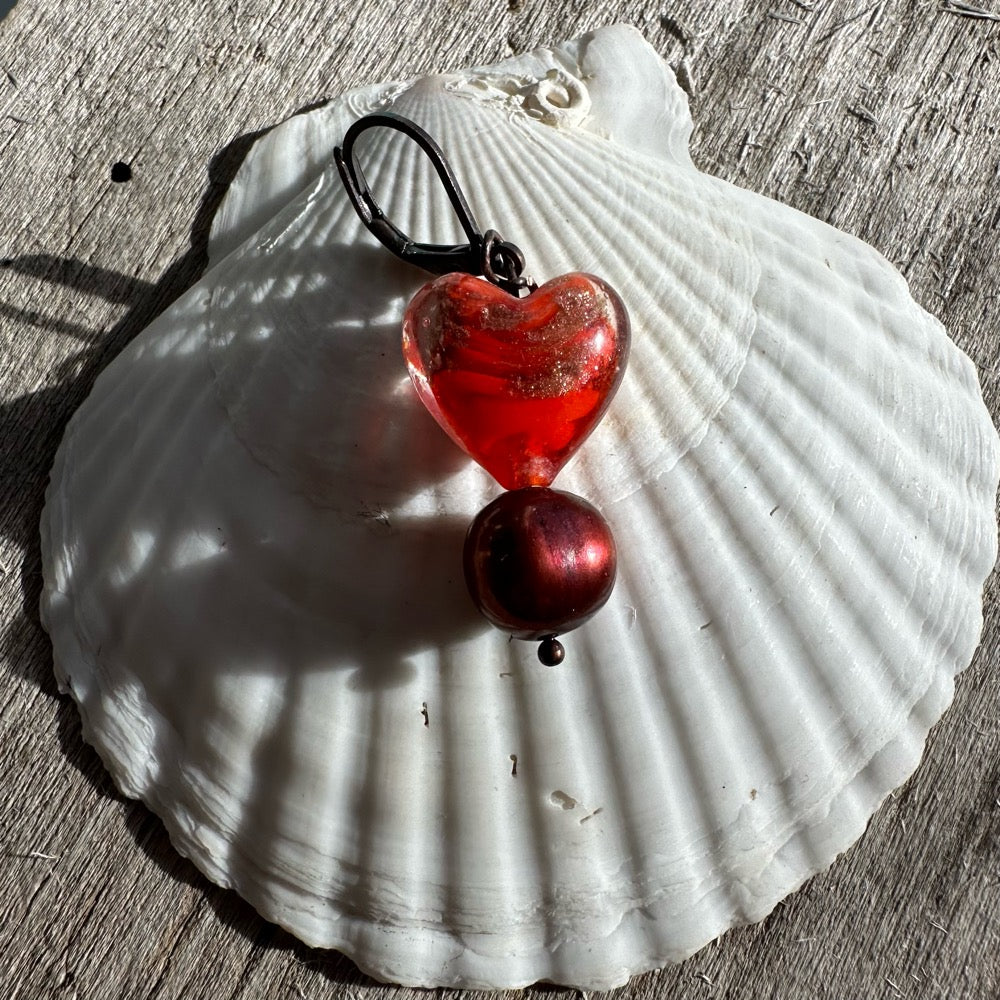 A beautiful, flameworked glass heart and a freshwater pearl on an ant copper opening clasp.