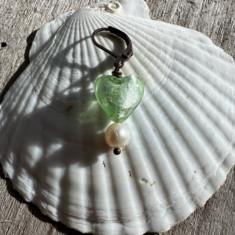 A beautiful, flameworked glass heart and a freshwater pearl on an ant copper opening clasp.