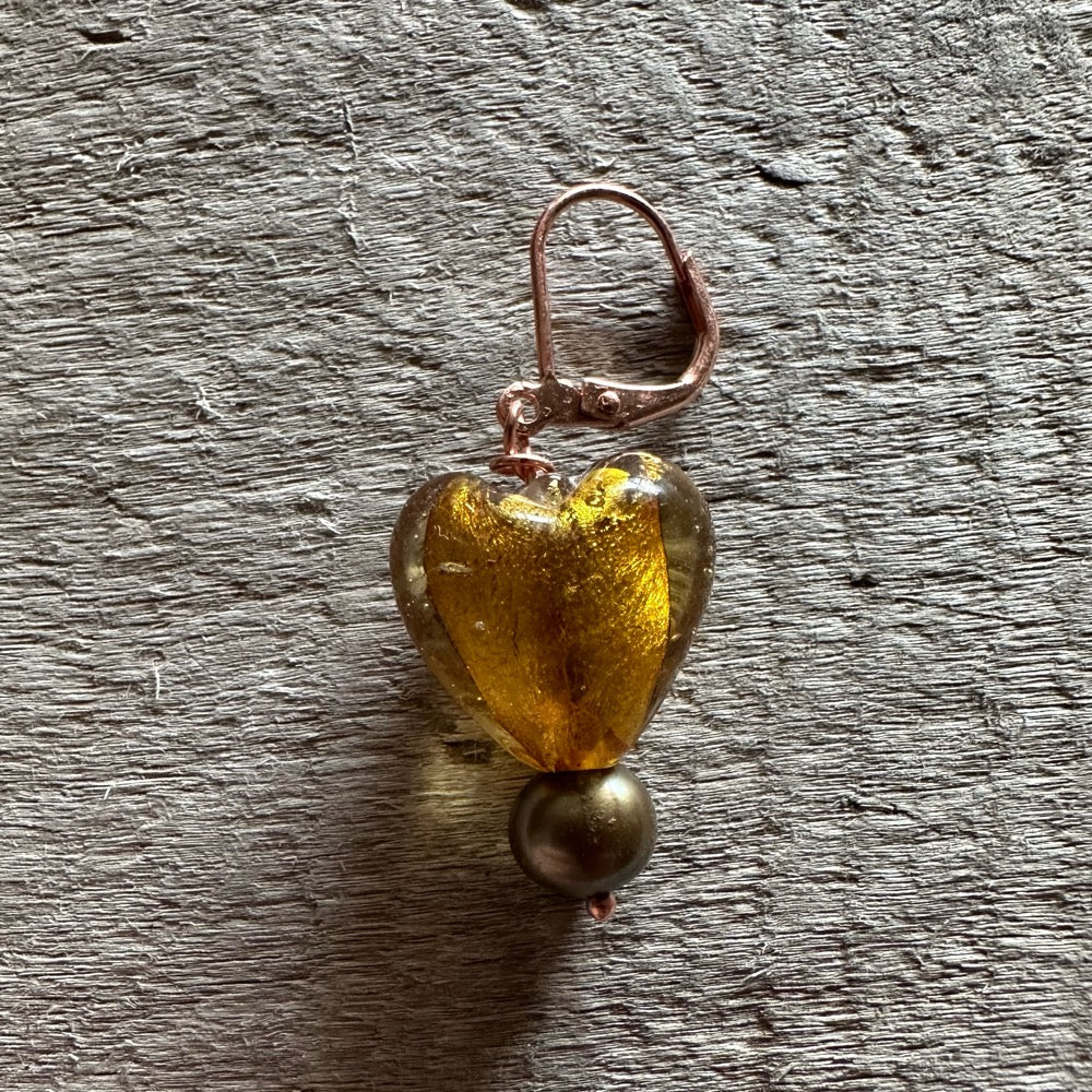 A beautiful, flameworked glass heart and a freshwater pearl on a shiny copper opening clasp.