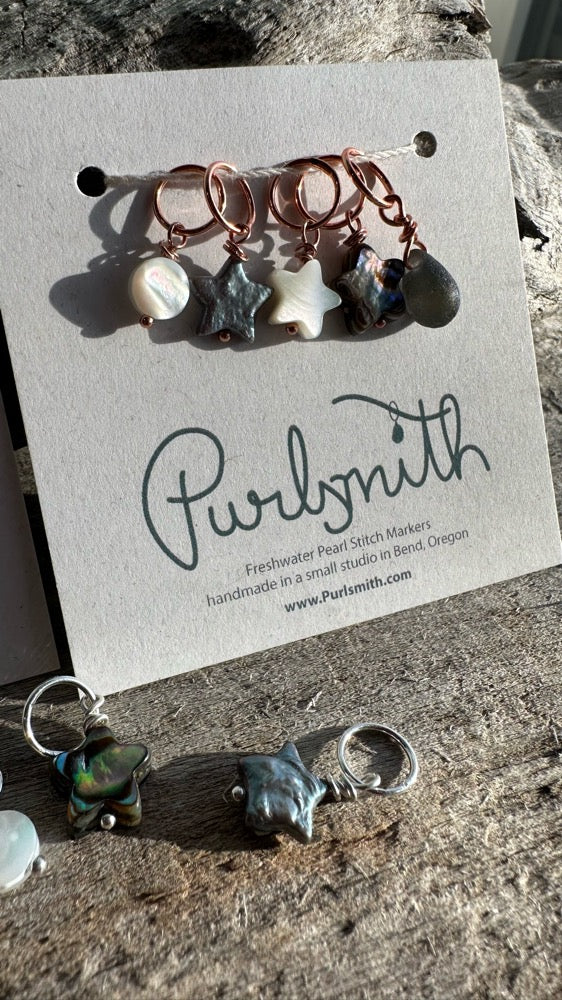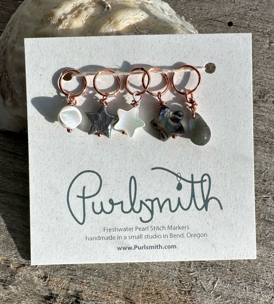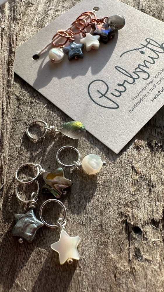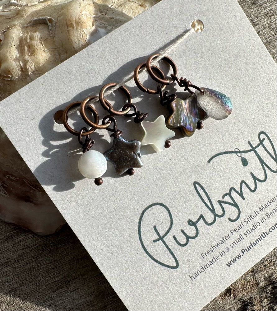 A set of 5- a mother of pearl moon, and a glass drop with 3 stars - 1 freshwater pearl, 1 mother of pearl, 1 abalone